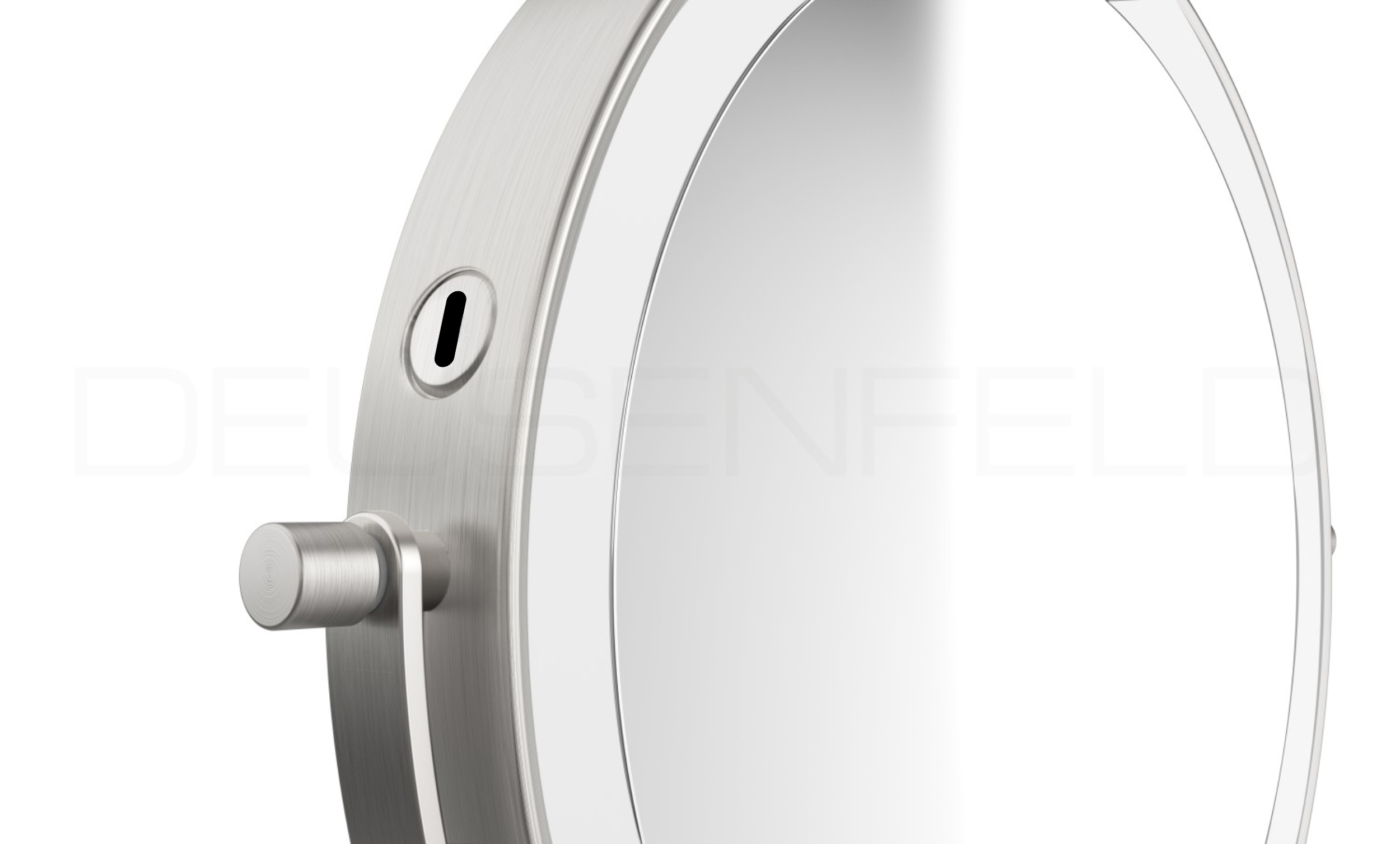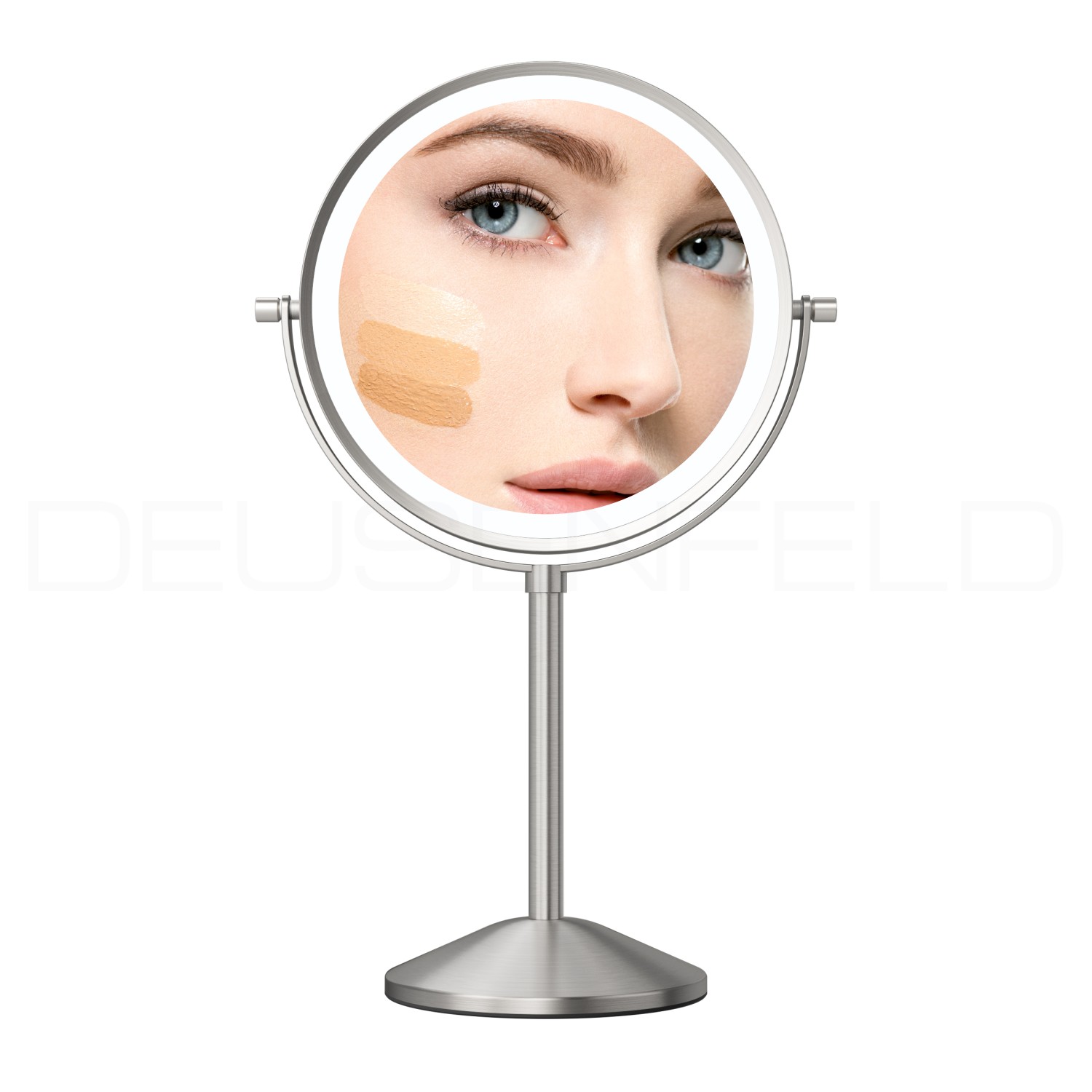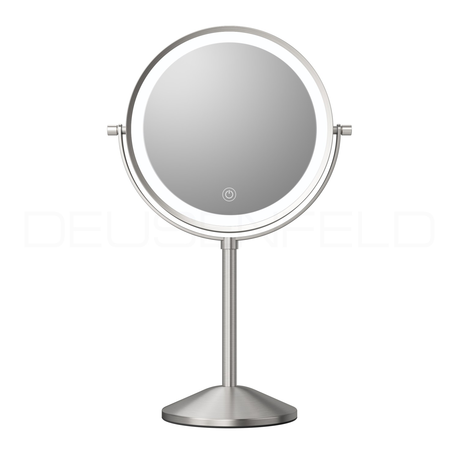 DEUSENFELD SL5EFA - Akku Batterie LED Doppel Stand Kosmetikspiegel, 5x Vergrößerung + Normalspiegel, Ø20cm, 360° horizontal schwenkbar, 3 einstellbare Lichtfarben, 10 Min. Timer, Dimmer, 3000mAh Lithium Akku, USB-C, Edelstahl Finish